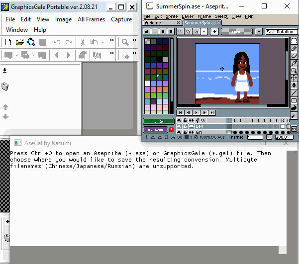 This is a simple program that allows conversion between Aseprite files (.ase) and GraphicsGale files (.gal). Files must be 32 or 24 bit before conversion. Press ctrl+o to open a file. After selecting the file to convert, another file dialog will open to choose where to save the result.